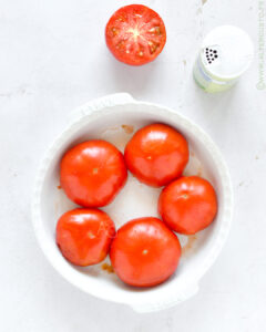- Retourner les tomates et ne pas jeter l’eau de végétation. Laissez-la au fond du plat.
